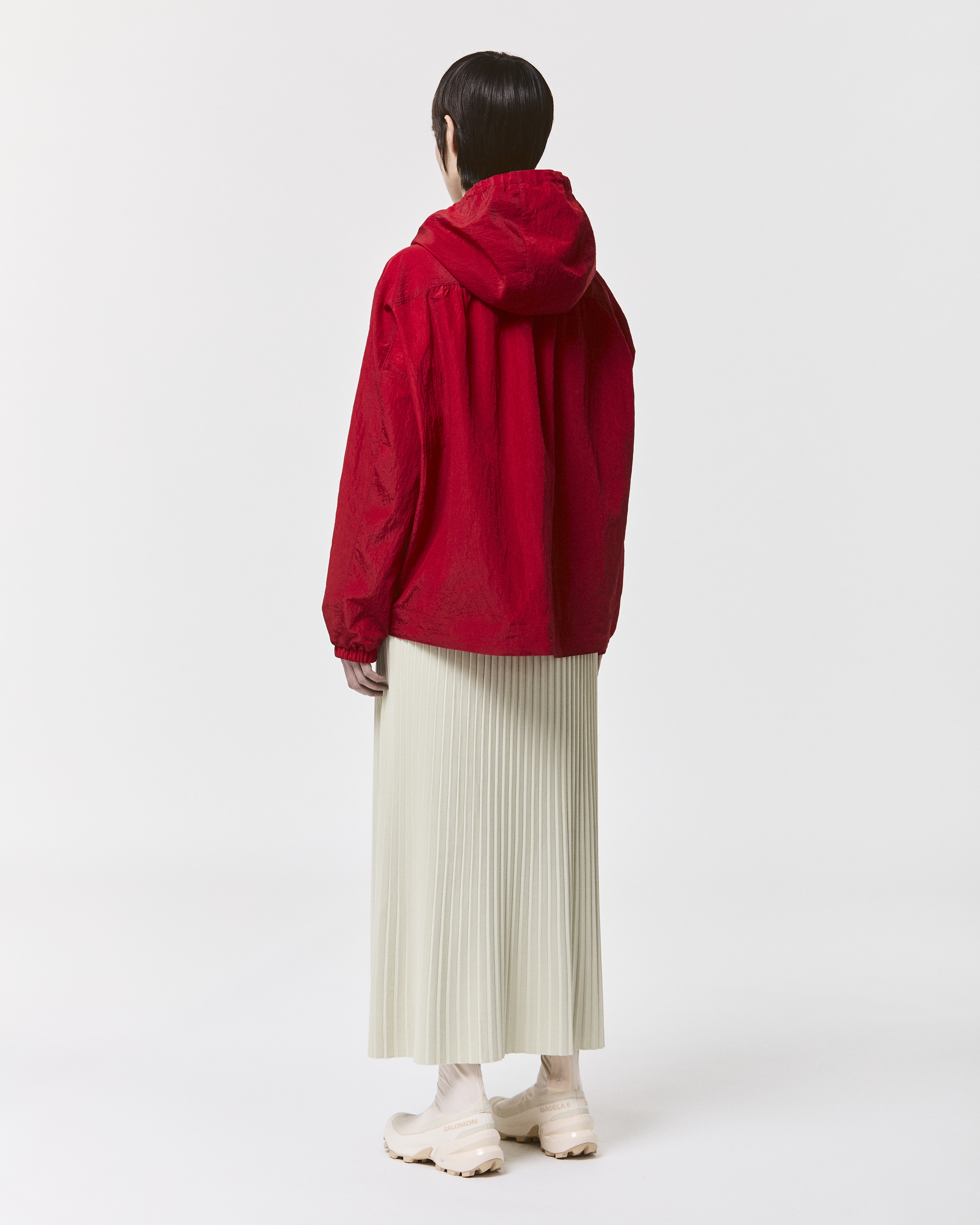 リラックス感のあるフレアシルエットが動きやすさを確保し、ネックのドローストリングやバックのギャザー、広がりのある裾が女性らしさを引き立てます。