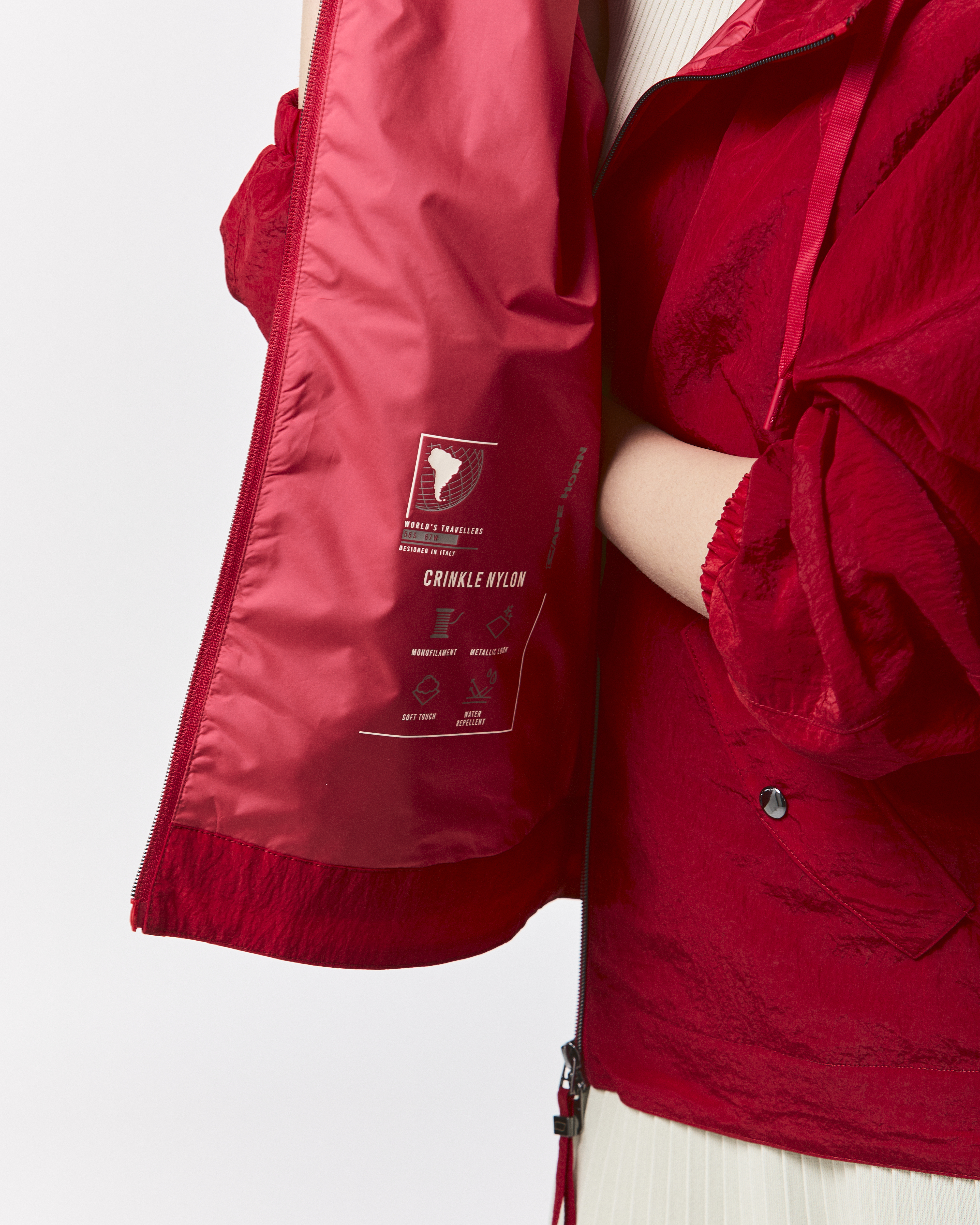 メタリックな光沢感とシワ加工による表情が特徴のショートジャケット。