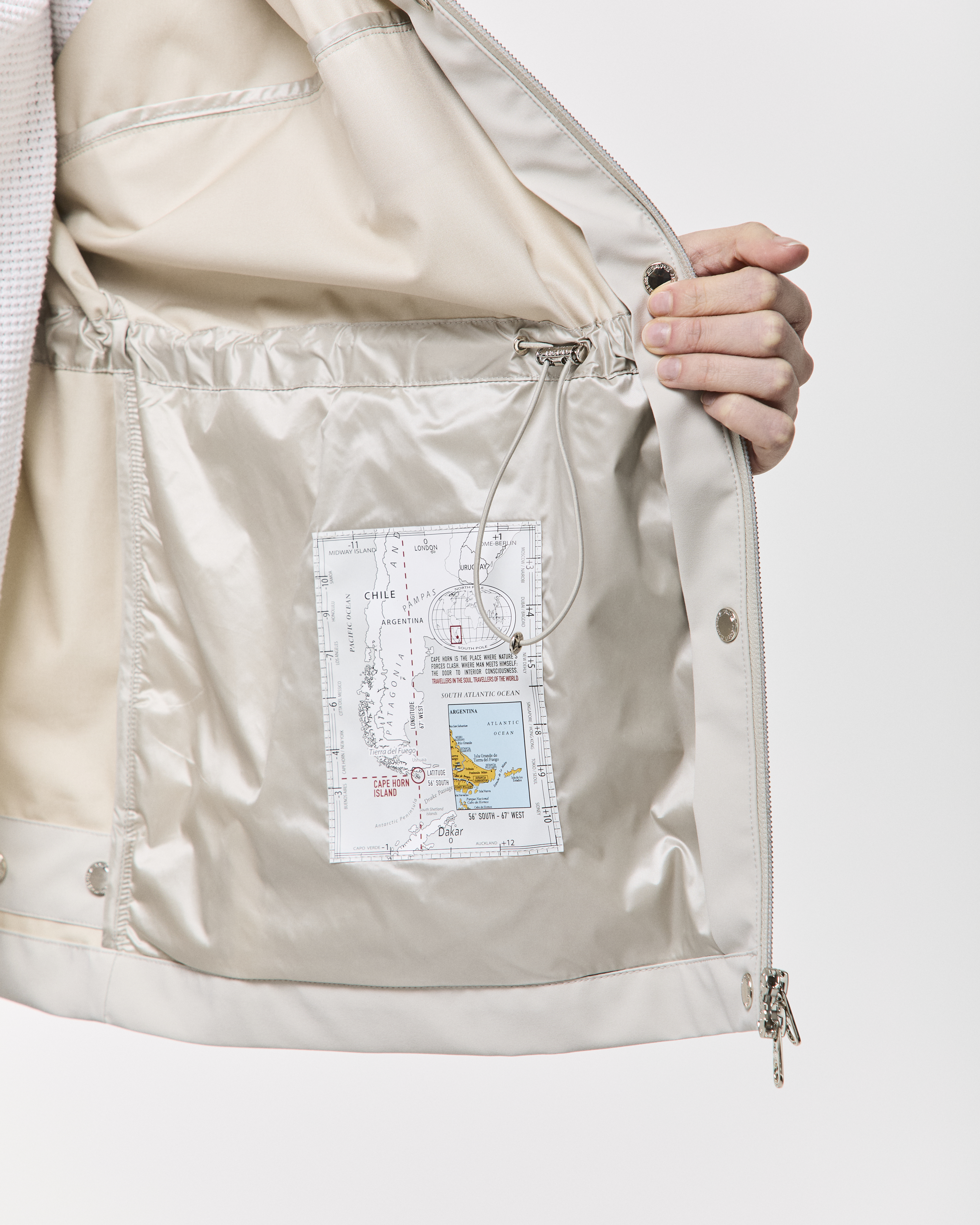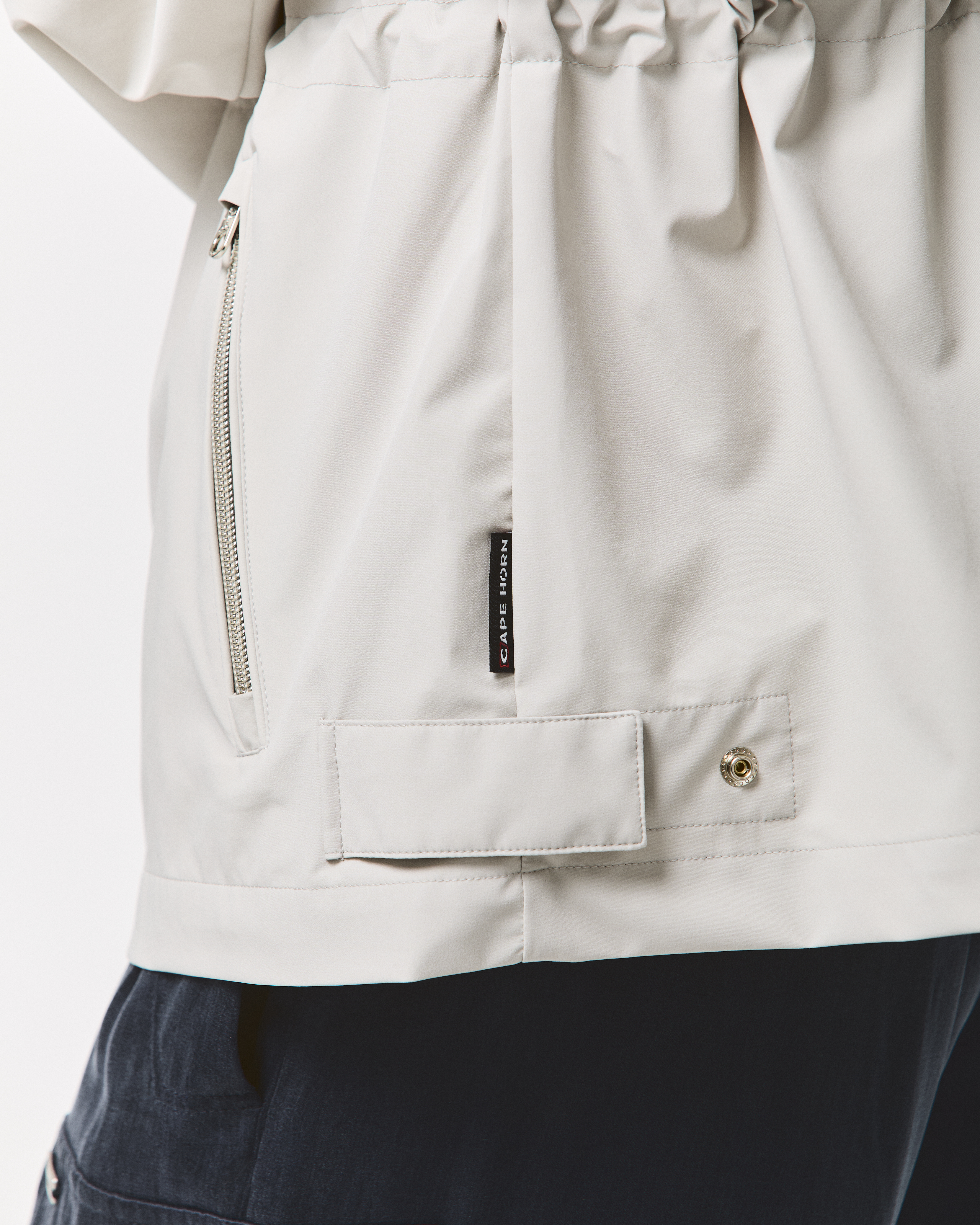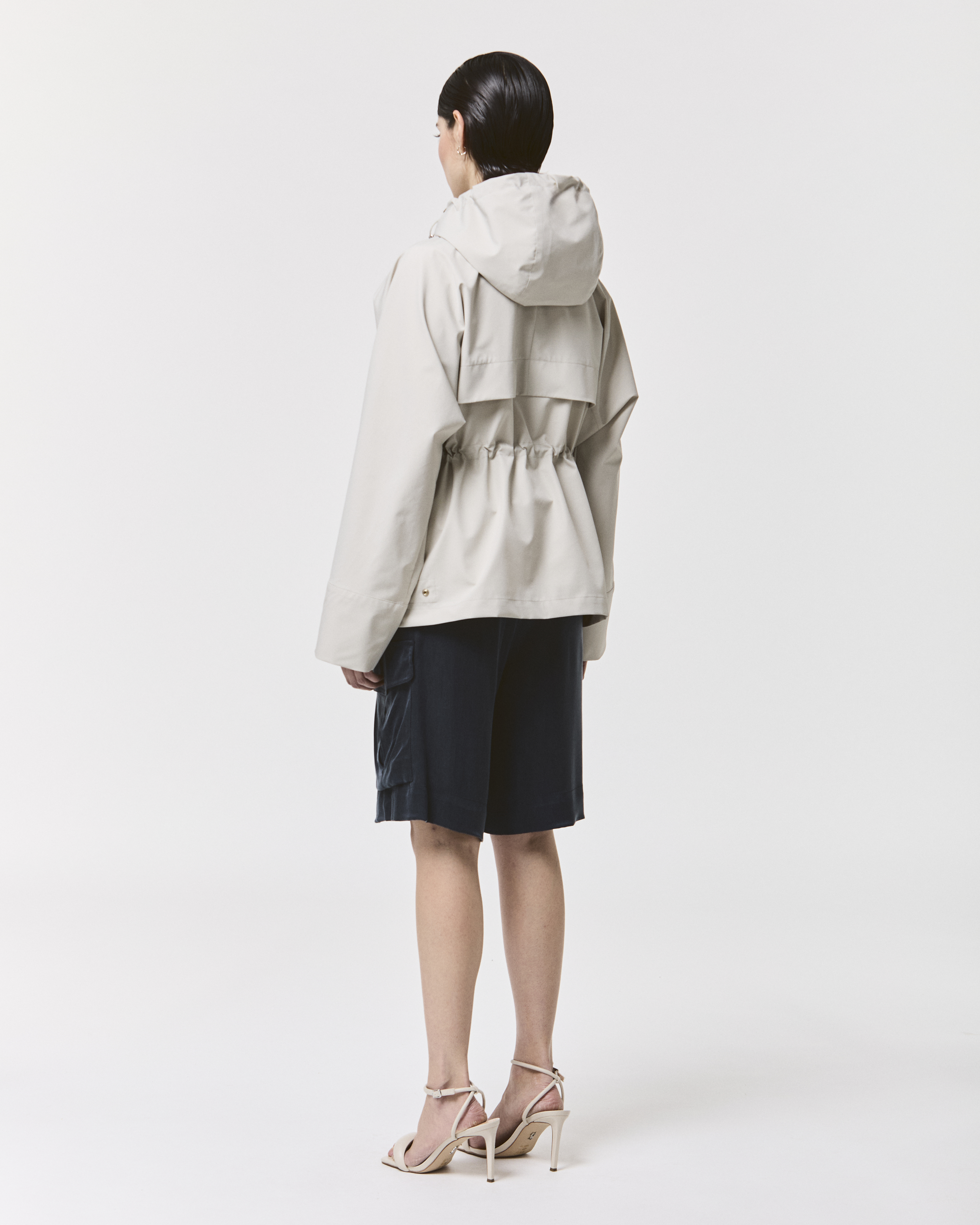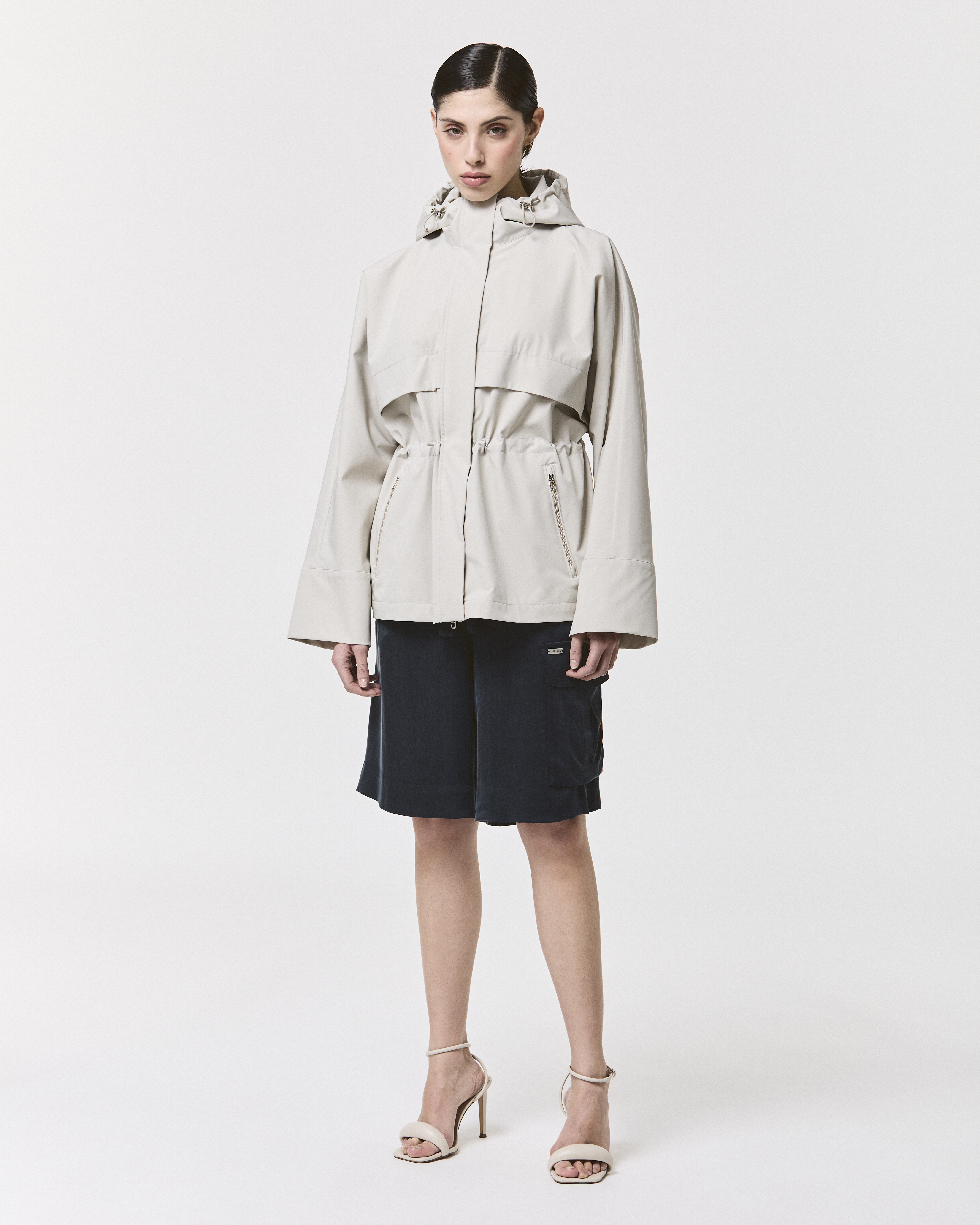 女性らしいシルエットと機能性を兼ね備えた、3レイヤーのストレッチナイロンジャケット。